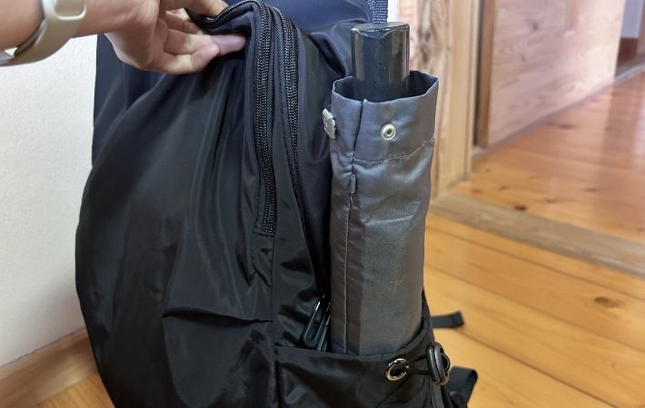 また、はっ水素材が採用されているので旅行やアウトドアにも安心。完全防水ではありませんが、ちょっとした雨なら中身を濡らさず持ち運べますよ。