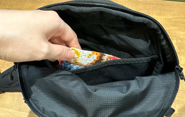 フロント部分のポケットにはファスナーがついており、スマホやイヤホンなどサッと取り出したいものを収納できますよ。