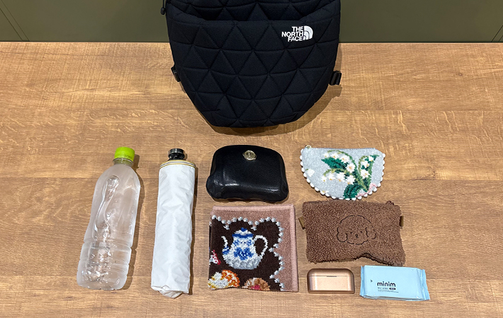 財布やスマホ、ポーチはもちろん、500mLのペットボトルや折りたたみ傘も、この通りスッキリと収まります!