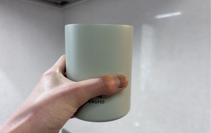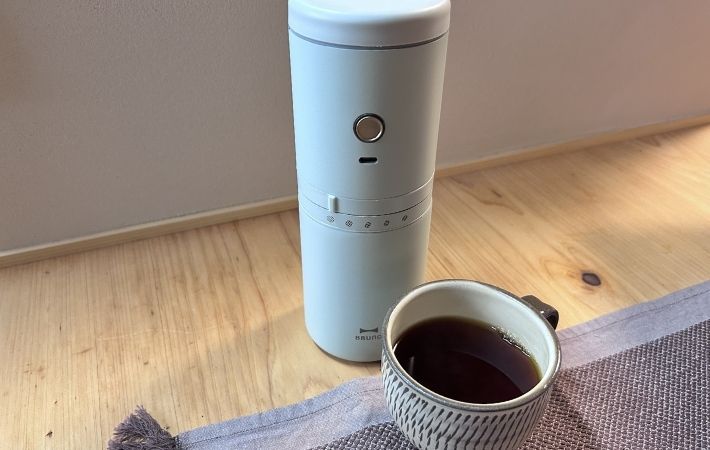 「春の行楽シーズンに」「自宅で気軽に本格的なコーヒーを」 BRUNOの『電動ミルコーヒーメーカー』をレビュー ホーム・キッチン By - shio 更新:2026-04-10 ※本記事はUPDATEが独自に制作したコンテンツです。また、本記事を経由して商品の購入が発生した場合に、ECサイト等から送客手数料を受領することがあります。 春の暖かな日差しに誘われて、公園でのピクニックやキャンプなど、外に出かけるのが楽しみな季節になりましたね。 今回はそんな行楽のお供に、贅沢な『挽きたての一杯』をどこでも手軽に楽しめるアイテムをレビューします。 それがこちら、『BRUNO(ブルーノ)』の『パーソナル電動ミルコーヒーメーカー ミント』(以下、パーソナル電動ミルコーヒーメーカー)です。 Amazonで『BRUNO パーソナル電動ミルコーヒーメーカー ミント』を見る 楽天市場で『BRUNO パーソナル電動ミルコーヒーメーカー ミント』を見る 電動ミル、ドリッパー、真空タンブラーが一体になった、まさに『持ち運べるコーヒーショップ』のようなアイデア商品。 スッキリとしたフォルムと春らしいミントカラーも気分を上げてくれますよ。それでは早速詳しくレビューします。 目次 1. BRUNO『パーソナル電動ミルコーヒーメーカー』を徹底チェック1.1. これ一台で本格コーヒーが気軽に楽しめる驚きの設計1.2. 自分好みの味と風味に『5段階の粒度調整機能』1.3. 電池要らずだからエコで経済的2. コーヒーを淹れてみた3. まとめ BRUNO『パーソナル電動ミルコーヒーメーカー』を徹底チェック ・本体サイズ(約):幅8cm×奥行き7.8cm×高さ21.7cm ・重量(約):625g これ一台で本格コーヒーが気軽に楽しめる驚きの設計 『パーソナル電動ミルコーヒーメーカー』の凄さは、コーヒーを淹れて飲むために必要な工程すべてこの1台で完結することです。 上部にコーン式電動ミル、中間にステンレス製のメッシュフィルター、そして下部が真空二重構造のタンブラーという構造になっています。 筆者 タンブラーの保温効力は36度以上(6時間)、保冷効力は11度以下(6時間)です! コーヒー豆さえ用意すれば、挽きは機械におまかせ。最後にお湯を注ぐだけで、どこでも本格的なコーヒーの香りを堪能できるのが最大の魅力です。 自分好みの味と風味に『5段階の粒度調整機能』 コーン式の電動ミルは豆を均一のサイズに挽いてくれて、雑味を出にくくしてくれます。 さらに『挽き目調整リング』で『極細挽き』から『粗挽き』まで5段階に調整が可能。 その日の気分や豆の種類に合わせて、自分好みの味わいを細かく整えることができます。 電池要らずだからエコで経済的 USB充電式なので、事前に充電しておけばキャンプ場や公園のベンチなど、電源がない場所でも使えるのもポイントです。 充電の目安はバッテリーインジゲーターの点灯範囲で分かるようになっています。 また、ペーパーフィルター不要のステンレスメッシュフィルターを採用しているのもエコで経済的ですよね。 コーヒーを淹れてみた 本体はスリムでコンパクト。500㎖のペットボトルを一回り大きくしたようなサイズ感です。 手に取ると約625gのずっしりとした重みは感じますが、この中にミルとドリッパー、タンブラーがセットになっていると考えればこの重量に納得できると思います。 洗練されたデザインとミントカラーが空間をパッと明るく整えてくれるので、キッチンに出しっぱなしにしておいても違和感がありません。 使い方は簡単です。10〜15gほどのコーヒー豆をセットして、モーター部分をセット。 『挽き目調整リング』を好みの位置に合わせて、スイッチを2秒長押しすると、豆挽きがスタートします。 後はこのまま待つだけ。約120秒で豆挽きが完了します。 作動音は想像よりも静かに感じました。終わりが近づくと軽めの音に変化します。 電動なので力もいらず、忙しい朝の時間でも『ながら作業』で豆が挽けるのは非常に便利です。 筆者 途中で止めたい場合はもう一度ボタンを押してください。 豆が挽けたら、そのまま上部のモーター部分を外して、付属のドリッパーを取り出します。 ドリッパーの側面についているストッパーを外してタンブラーにセットし、お湯をゆっくりと注ぎます。 筆者 240㎖以上入れるとあふれるので注意してくださいね。 上部の蓋はドリッパーの受け皿として使えます。こういう細かい工夫も嬉しいポイントです。 そして、肝心のコーヒーのお味はというと…。 ステンレスメッシュフィルターのおかげで、雑味ゼロのコクのある深い味わいのコーヒーを淹れることができました。 コーヒーの油分までしっかり抽出され、本格的な香りがします。 お手入れも簡単です。パーツごとに分解し、洗うだけですぐにきれいになります。 ただし、モーター部は水洗いできません。濡らして固く絞った布などでやさしく拭いてください。 まとめ BRUNOの『パーソナル電動ミルコーヒーメーカー』は、日常を少しだけ特別に、そして軽やかに整えてくれる魔法のようなア
