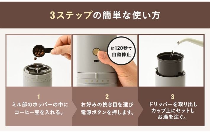 コーヒー豆さえ用意すれば、挽きは機械におまかせ。最後にお湯を注ぐだけで、どこでも本格的なコーヒーの香りを堪能できるのが最大の魅力です。