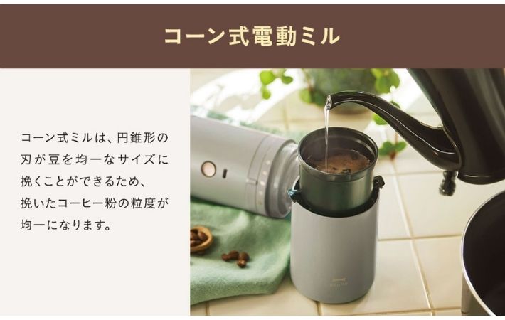 コーン式の電動ミルは豆を均一のサイズに挽いてくれて、雑味を出にくくしてくれます。