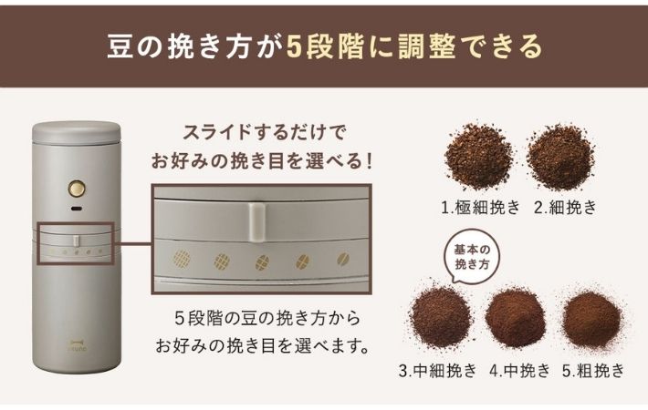 さらに『挽き目調整リング』で『極細挽き』から『粗挽き』まで5段階に調整が可能。
