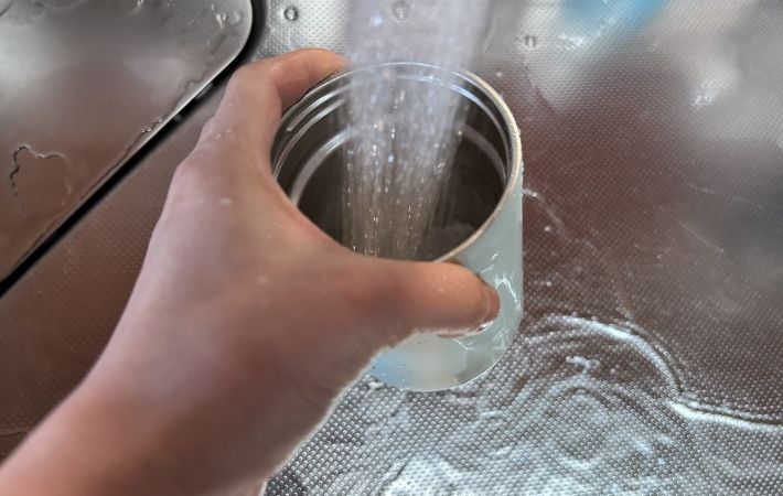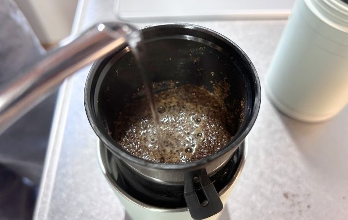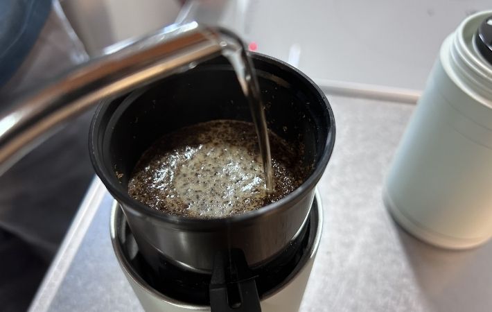 ドリッパーの側面についているストッパーを外してタンブラーにセットし、お湯をゆっくりと注ぎます。