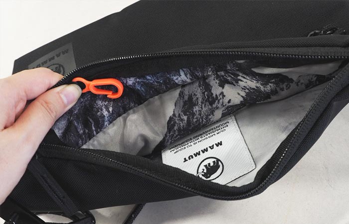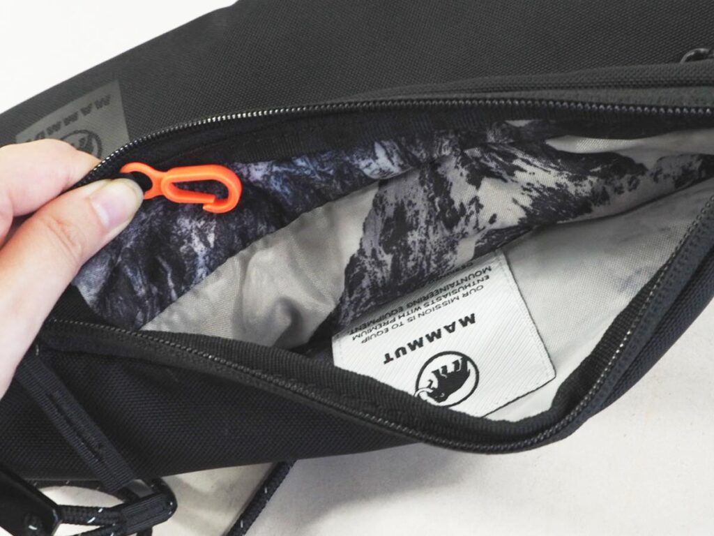 メインポケットを開けると、裏地には雪山をイメージしたプリントが。ミニカラビナのキーフックには、コインケースなどを引っかけてもいいでしょう。