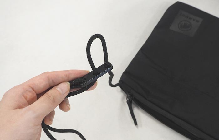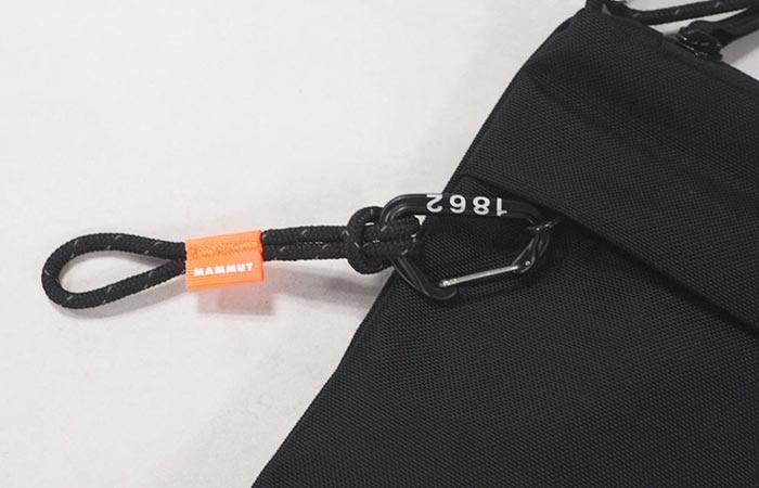 フロントポケットについたカラビナの『1862』はマムートの創業年。コードにはアウトドアブランドらしいセーフティオレンジがあしらわれ、全体のアクセントになっています。