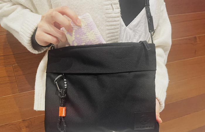ショルダーストラップを短くすれば、人混みが多いイベント時でも、物がサッと取り出せます。