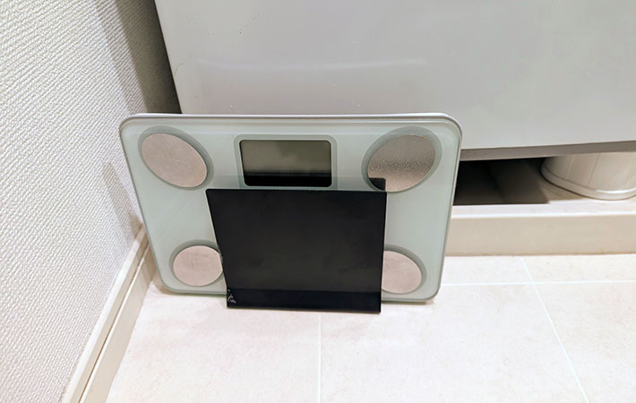 さらに、意外な使い道としてぴったりだったのが、収納場所に困っていた洗面所の体重計でした。