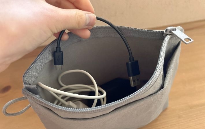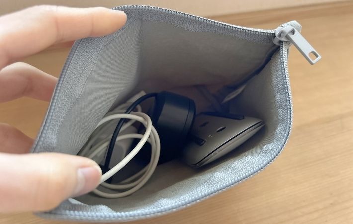 モバイルバッテリーや充電ケーブル、あるいはメイク用品など、バッグの中で散らばりがちなアイテムを1つにまとめて美しく整えることができますよ。