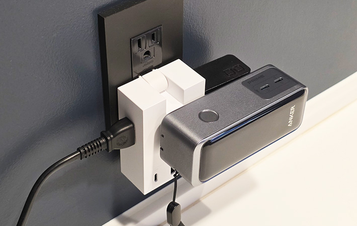 実際にノートPC用の充電器やスマホのアダプタなど、サイズの異なるものをいくつか接続してみても、互いにぶつかることなく快適に使えました。