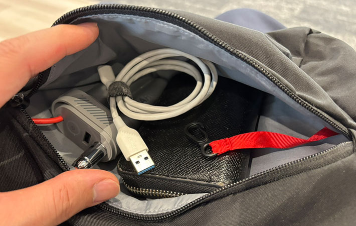 フロントポケットはモバイルバッテリーやUSBケーブルが入る大きさで、小物の収納に向いています。