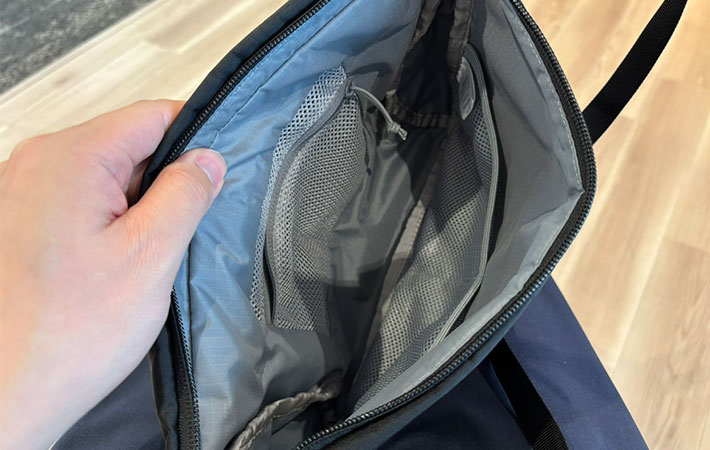 内部についているのは内ポケット2つと、ファスナーポケット1つ。いずれもメッシュ素材でできていて、中身が見やすい構造です。