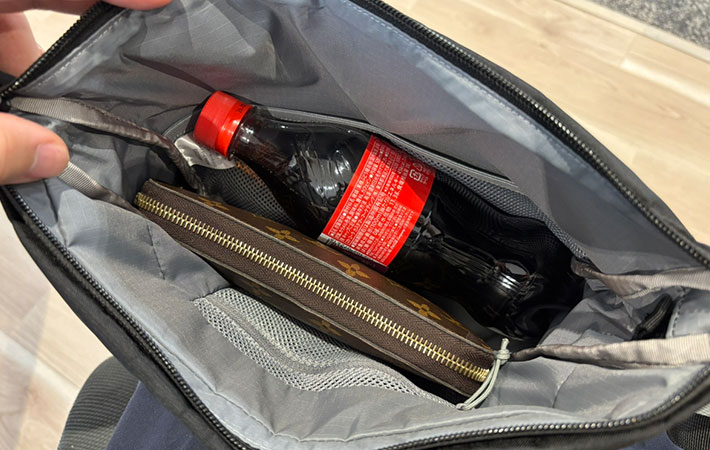 500mLのペットボトルや長財布もすっぽり収まり、しかもまだまだ余裕があるサイズ感。「5Lにしては結構入るな…」という印象でした。