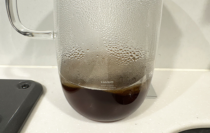 抽出が終わったら水を足しましょう。取っ手の下端が1000mLの目安なので、だいたいこのあたりまで水を注げばOKです。