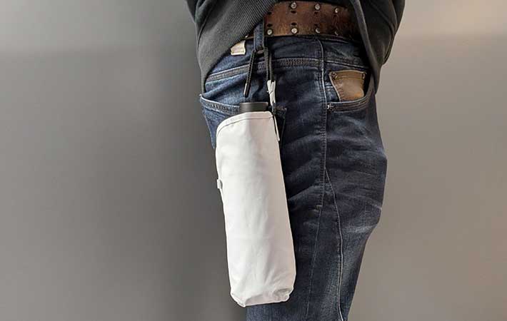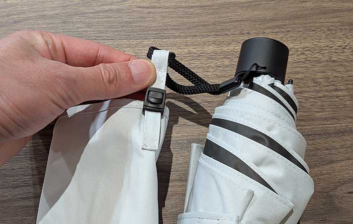 付属の収納袋は日傘とつながっており、バッグやベルトループに取りつけることも可能。