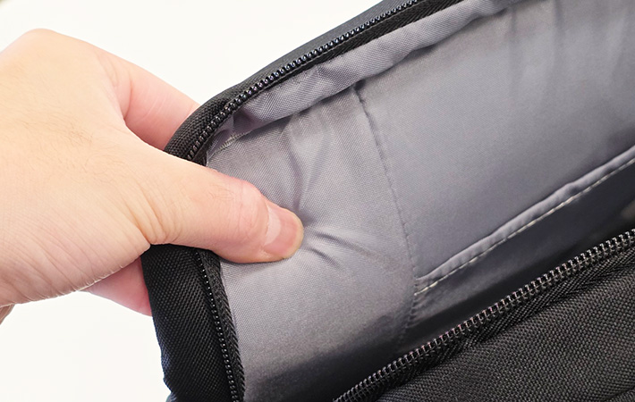 内部はクッション性のある素材が使われており、底面や両側面にも肉厚なパッドがしっかり配置されています。