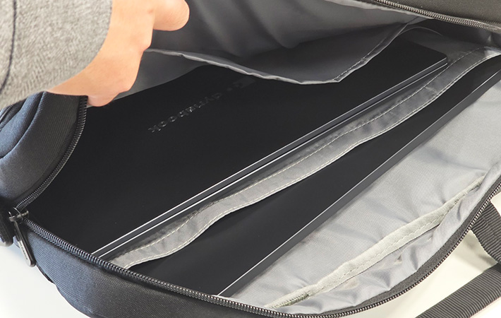 やや厚みのあるノートPCでも余裕を持って収納できるうえ、両サイドにはマチのないポケットも備わっています。