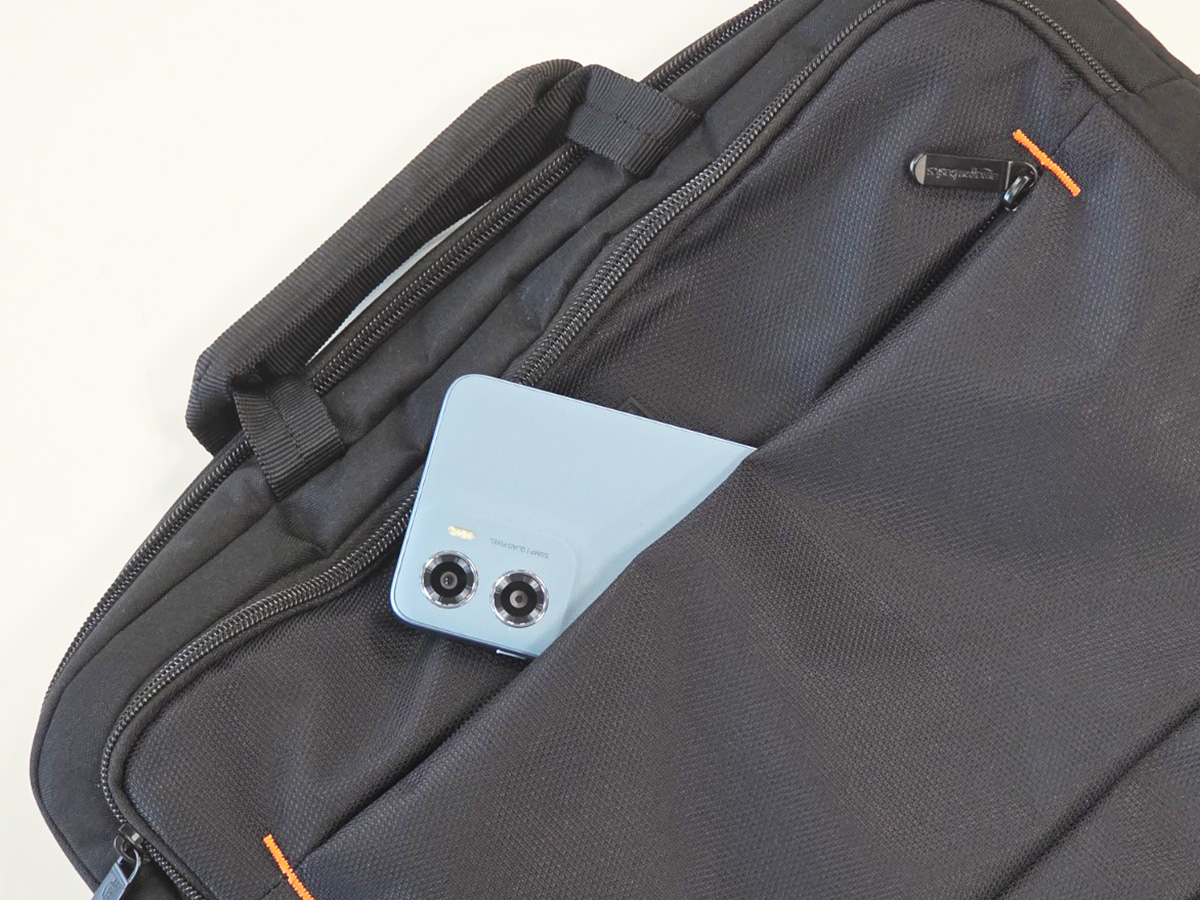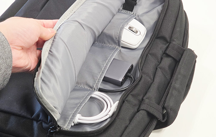 大きい方のポケットはマウスや充電器などの周辺機器を収納するのにちょうどよく、上部を折り返して開ける設計になっているため中身をスムーズに取り出せます。