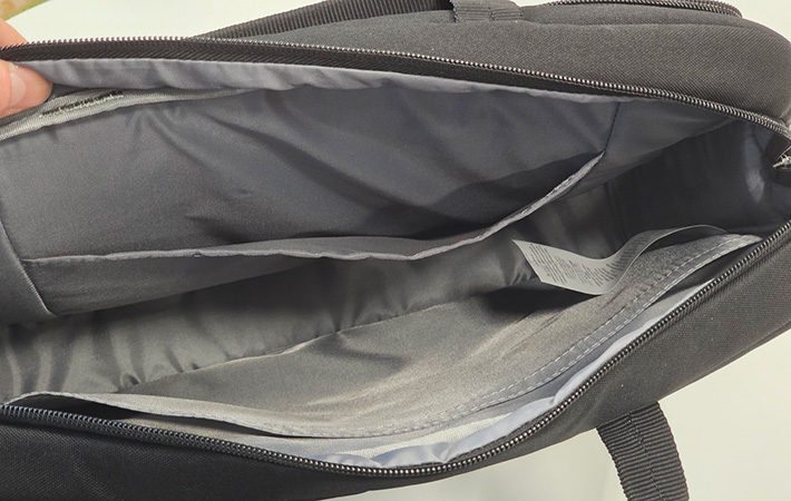 大きく開くため中身を確認しやすく、出し入れもストレスを感じません。実際に約13インチのノートPCを入れてみるとやや余裕があり、周囲にゆとりを残して収納できました。