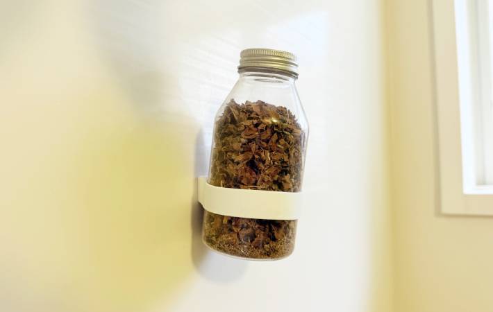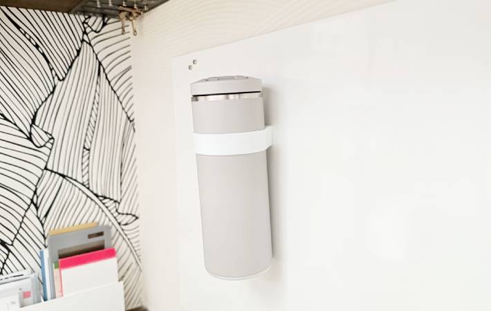 山崎実業の『マグネット シリコーンバンド』は、手持ちのボトルに装着することで『浮かせる収納』を実現できるアイテムです。