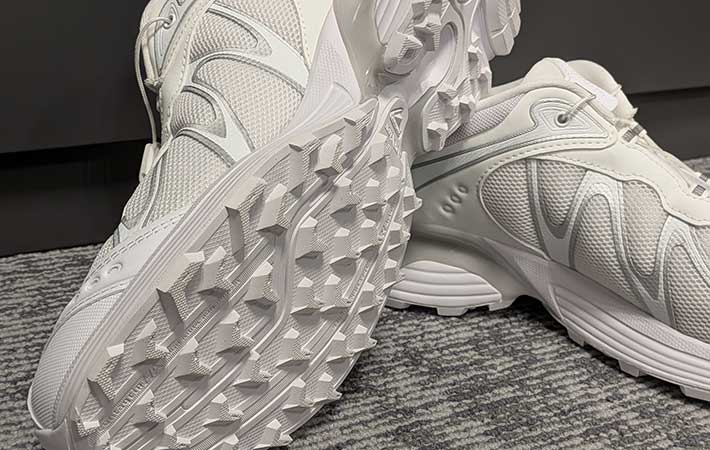 トレイルランニングに使える耐久性や安定感を持っていますが、アッパーのデザインは単層構造のメッシュが使われ、かなりシンプル。