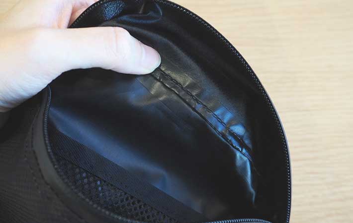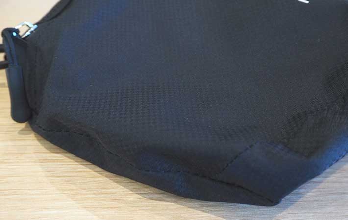 ボディの生地を触って感じたのは、「しっかりと水を弾いてくれそうな作りだ」ということ。『ウォータープルーフショルダーポケット』の生地はナイロン製で、全面に耐水コーティングが施されています。