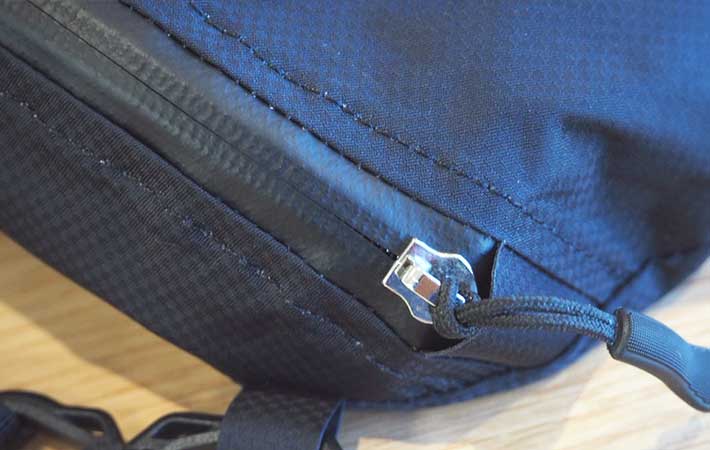 そして、縫い目の部分には水の浸入を防ぐシームシーリング処理が。ファスナーも止水仕様で、高い防水性が備わったバッグです。