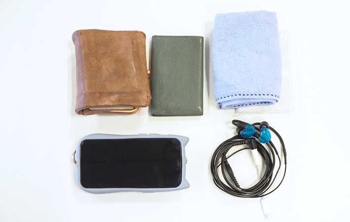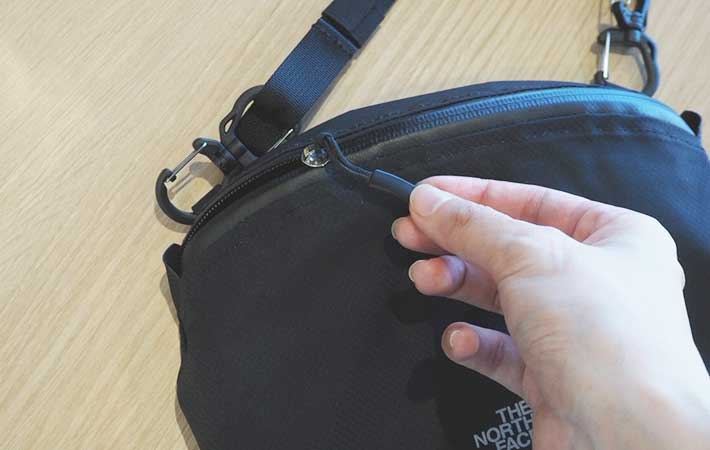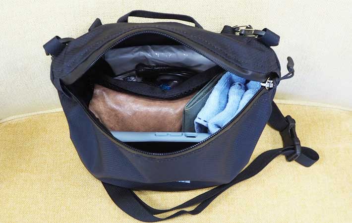 『ウォータープルーフショルダーポケット』に、すぐに取り出したい物や貴重品を収納してみました。