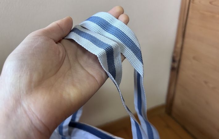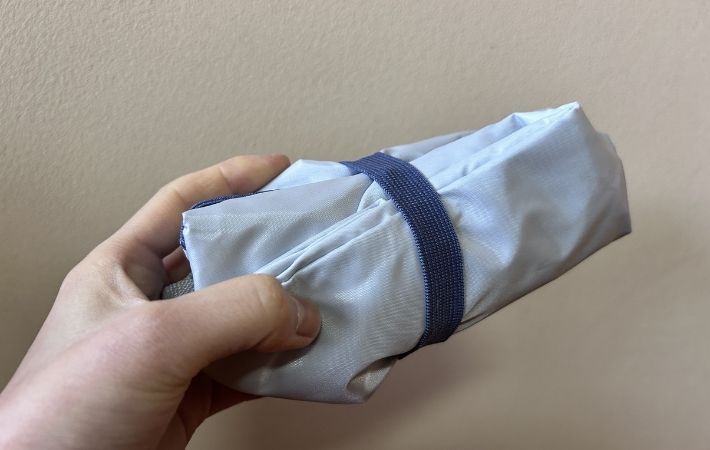 これだけのサイズ感ながら、使わない時はクルクルと丸めてゴムバンドで固定すると…こんなにコンパクトになります。