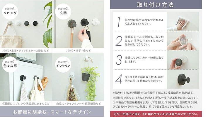 よくあるマグネットやネジ止め、穴あけ式などのタイプではなく、吸盤で取りつけるので、フックを設置できる場所がぐんと広がるのが最大の魅力なんです!