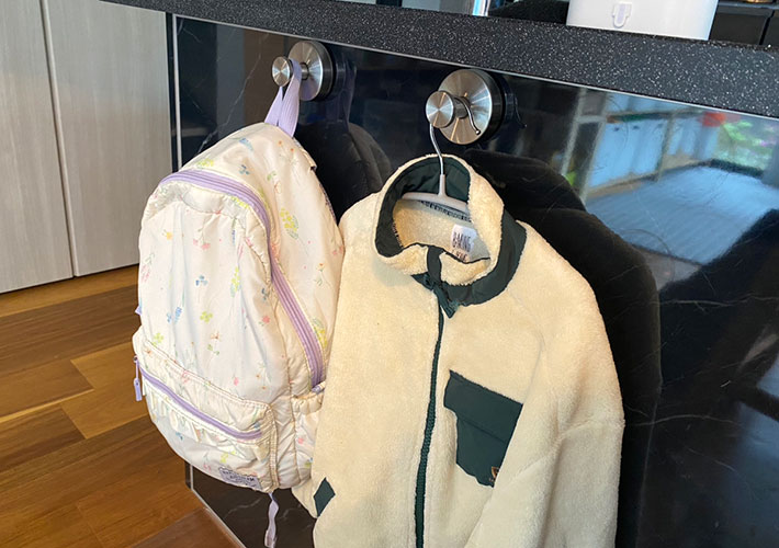 子供たちの登園リュックや、上着、帽子などを引っ掛けておくと、出発までの動線がスムーズに!朝のイライラがかなり解消されました。