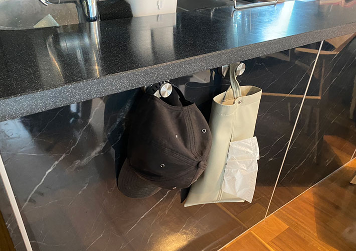 フックが空いている時は、帽子を掛けたり、エコバッグやティッシュケースを掛けておいたりと、その時必要なものを家族みんなで共用できて、今ではなくてはならない存在になっています!