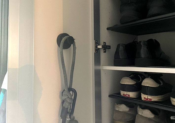 追加でブラックを購入した筆者は、シューズラック扉の裏側に取りつけて、愛犬の散歩に使うリード掛けにしています。