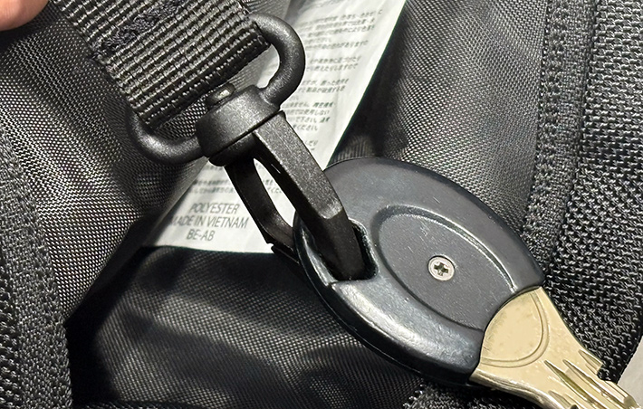 リュックのショルダーハーネスにストラップやリングがあれば、縦・横の面ファスナーでしっかりと固定することができます。