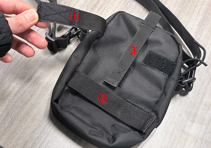 本体の裏面には、リュックのショルダーハーネスに取りつけ可能な面ファスナーを3本装備。