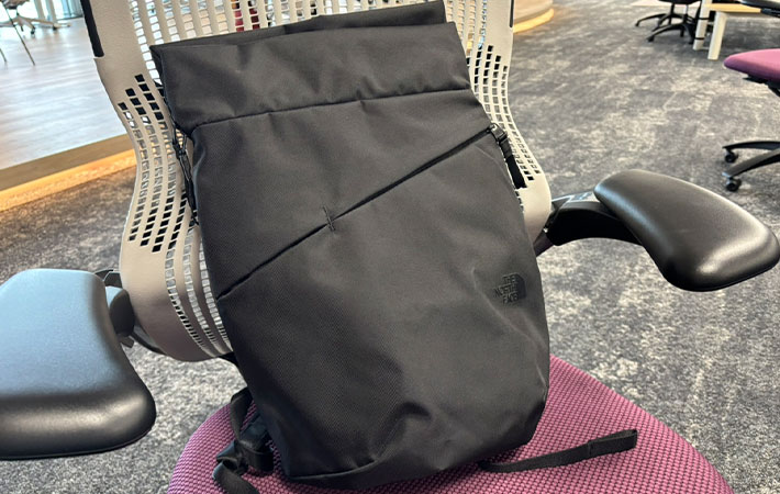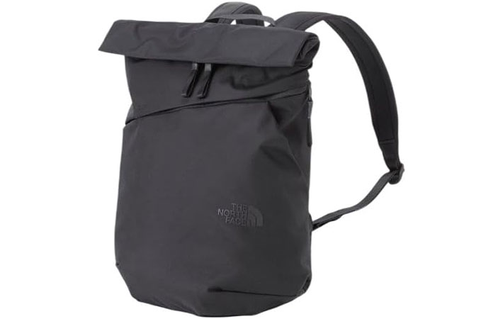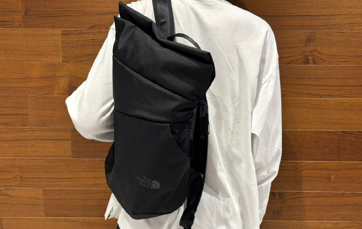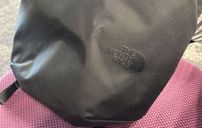 ノースフェイスのロゴは同色系でプリントされていて、さりげないアクセントに。スーツ姿でも、カジュアルな服装でも、どちらでも浮かない印象に仕上がっています。