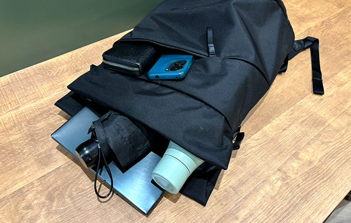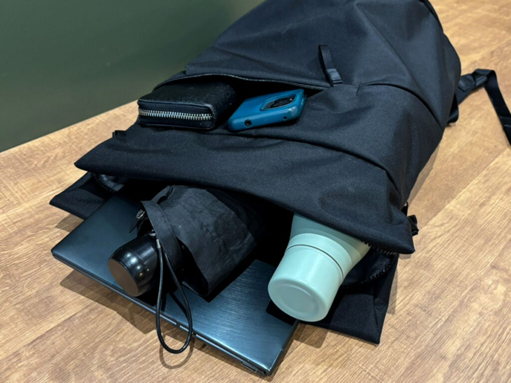 内部には13インチまでのノートパソコンに対応したスリーブを装備。そのほか財布やスマホ、水筒、折りたたみ傘を入れても、まだ余裕があります。