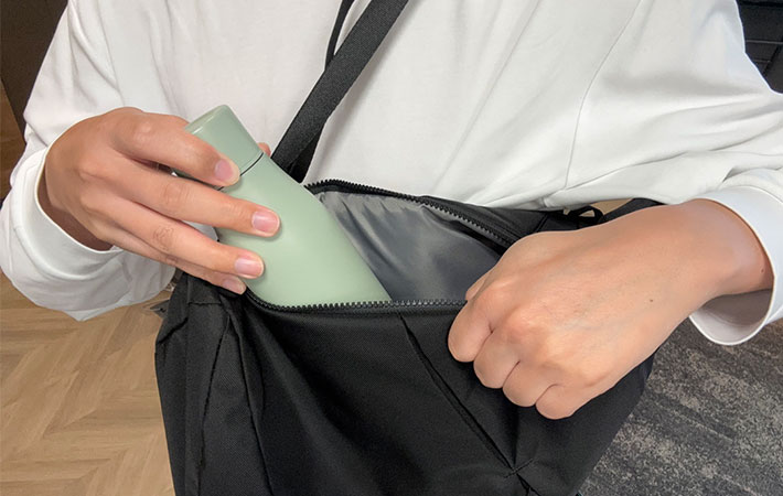 リュックをわざわざ下ろして上部からごそごそ取り出す必要がなく、背負ったままサイドから手を入れて取り出せる構造です。