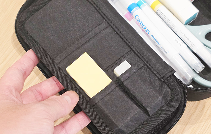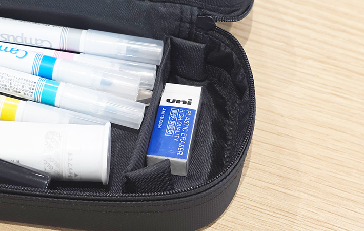 内部には仕切りもあり、小さいスペースには消しゴムなどの細かなアイテムを分けて入れられます。