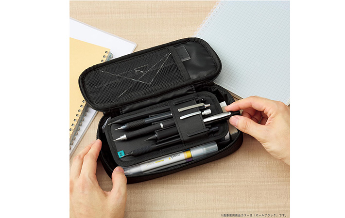 見た目はすっきりとしたままで、カバンの中にも収まりやすいサイズ感。整理しながら収納できる上にスマートに持ち運べるのは、毎日使うペンケースとして、非常に魅力的なポイントです。