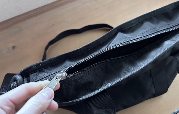 開口部が広いため、ダブルファスナーを全開にすると中身が隅々まで確認できます。底に沈んだ鍵や小物を探してガサゴソするストレスがありません。