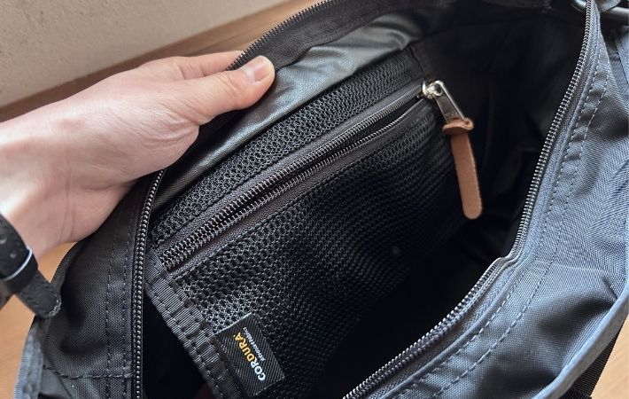 メインコンパートメントの内側には、小物の仕分けに便利なオープンポケットが2つ、さらに貴重品を入れておくのに安心なメッシュファスナーポケットが1つ備わっています。