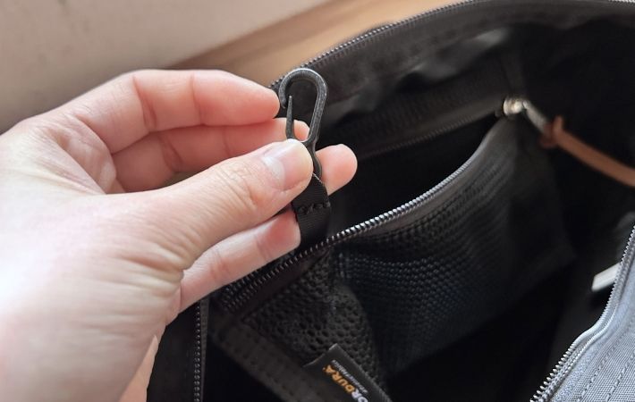 中にはキーフックもついているので、バッグの中で迷子になりがちな鍵の定位置をキープできます。