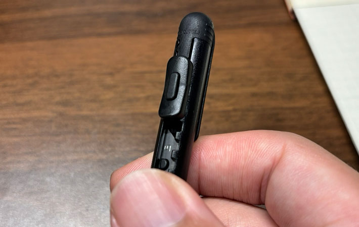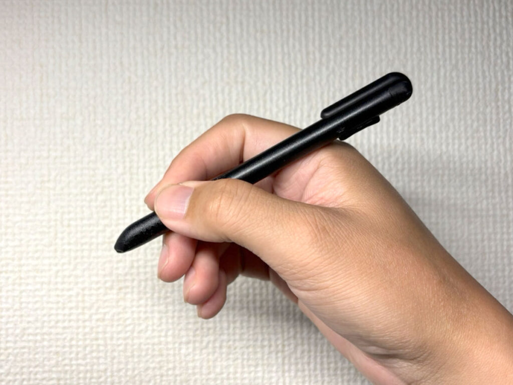 全長13.7cm、直径1cmの円柱形で、ボディは黒一色ですっきりしています。クリップもついているので、ペンケースに入れておいても違和感はありません。