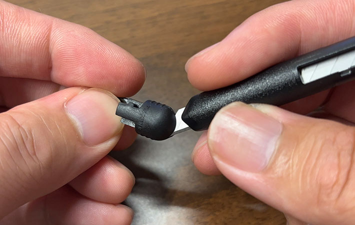 後端部には刃折りキャップが内蔵されていて、折った刃を安全に処理できます。