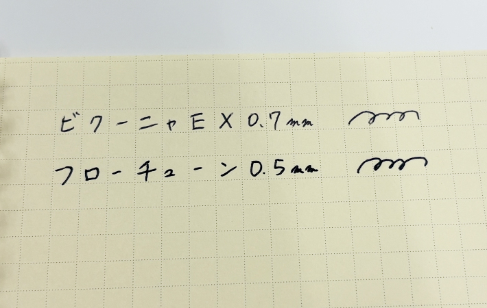 『ビクーニャEX』は、0.7mmの低粘度油性ボールペンですが、比べてみると0.5mmの『フローチューン』のほうが、線幅がむしろ太く見えます。