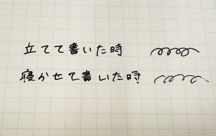 実際に比較してみると、やはり寝かせて書いた時はインクの出方にムラが出てしまいました。