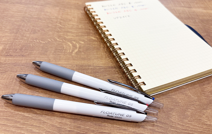 今手に入れたいボールペンはこれ! 浮遊感のある書き心地が特徴の『フローチューン』とは? 生活雑貨 By - さいゆか 更新:2026-04-14 ※本記事はUPDATEが独自に制作したコンテンツです。また、本記事を経由して商品の購入が発生した場合に、ECサイト等から送客手数料を受領することがあります。 手帳やノートへのメモ書きや、大事な書類の記入など、日常のさまざまな場面で活躍するボールペン。数々の商品の中から、あなたはどのように選んでいますか。 水性インクは軽い書き心地が特徴ですが、紙の裏にインクが抜けたり、こすれて文字がにじんだりするのが少し心配。 一方、油性インクは裏抜けしにくく水にも強い反面、書き味が重めで手が疲れてしまったり、インクがダマになりやすかったりします。 好みや用途に合わせて使い分けるのもいいですが、「どちらも妥協したくない」という人におすすめなのが、文具メーカー『ぺんてる』の『フローチューン』です! Amazonで見る 楽天市場で見る 新感覚の書き心地!?自然と筆が進む気持ちいいボールペンを見つけた 『フローチューン』は、極限まで摩擦を減らした『浮遊感のある書きごこち』が特徴の低粘度油性ボールペン。 水性インキのような摩擦レスな書き心地と、油性インキの耐水性をぎゅっと凝縮したハイブリッドなボールペンなのだとか。 開発には7年の歳月をかけ、100名以上の社員が携わったとあり、かなり力を入れた商品のようです。 カラーは黒、赤、青の3色で、太さは0.3mm、0.4mm、0.5mmの3種類。筆者は0.5mmを選びました。 本体は白とグレーを基調としたシンプルなデザイン。 重さは約35gと軽量で、誰でも持ちやすく設計されています。 筆記の邪魔にならない『ノイズレス』なデザインを採用しているそうで、全体的に凹凸が少ないのも特徴。 クリップが、本体の軸から生えているような形状は「ありそうでなかったな~」と思いました。 クリップだけが浮かないスマートなデザイン 『フローチューン』の書き心地を試してみた 実際に『フローチューン』で字を書いてみると、軽い筆圧でもスルスルと筆が進む印象です。 ペン先からインクがどんどん流れ出てくるため、書いている途中で何度も「本当に油性か?」と疑うほど。 油性インクとは思えないほどスルスル書ける! この快適な書き心地を実現しているのが、特殊なインクと、そのインクをなめらかに出すための構造です。 『フローチューン』の仕組み インクには、クッション成分を配合することで、ペン内部のパーツ同士の擦れを低減してくれるのだとか。 さらに、この特殊インクをたっぷりと流し出す技術と、高精細チップによってインクの流れを妨げないようにしているといいます。 その結果、まるで水性インクのような軽い書き心地を実現しているというわけですね! たくさんの技術が詰まっているペン先 これだけたっぷりとインクが出るため、発色がいいところも『フローチューン』の特徴。 3色で書き比べてみましたが、油性インクにしては、どれも色が濃く鮮やかな印象を受けました。 ※5mm方眼用紙を使用 インクがしっかり出るぶん、文字が太りやすい点は押さえておきたいポイントです。 筆者が使ったのは0.5mmタイプですが、「0.7mmくらいあるのでは?」と思うほど、太さが出る印象でした。 実際に、同じぺんてるが販売する、0.7mmの『ビクーニャEX』と比較したものがこちら。 『ビクーニャEX』は、0.7mmの低粘度油性ボールペンですが、比べてみると0.5mmの『フローチューン』のほうが、線幅がむしろ太く見えます。 「太すぎるのは少し苦手…」という人は、0.3mmや0.4mmを選んだほうがいいかもしれません。 筆者はぽってりとした太めの字が好みなので、むしろ「いつもより字が盛れているかも!」と感じました。 ちなみに、筆記中にペン先を止めると、紙にインクがじわっと広がります。 ペンを止めるとインクがにじんでくる 書くスピードによって、インクののり方にも差が出るようです。 実際に、速く書いた時とゆっくり書いた時では、以下の通り太さに変化がありました。 ゆっくり書くとより太めの線になる 紙への裏抜けについては、ゆっくり書くと目立ってしまうので注意が必要。 大事な書類や、紙質の薄い手帳などに書く際には、事前に試し書きをしてコツをつかむのがよさそうです。 写真上:速く書いた時、写真下:ゆっくり書いた時 一方で、これだけたっぷりインクが出ても、文字がよれない速乾性のよさは高ポイント! 書き始めは文字がツヤッとしますが、すぐに擦ってもインクが伸びることはありません。 すぐに擦ってもインクが伸びない! また、上から蛍光マーカーを引いてもにじまない耐水性の高さも「さすがだな」と思いました。 油性インキならではの頼もしさを、しっかり兼ね備えてくれていますよ。 角度によってはかすれやすいので注意 『フローチューン』を使う時に気をつけるポイントとして、ぺんてるのウェブサイトにも記載があるのが、ペンをなるべく