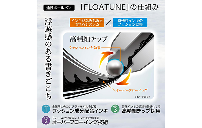 『フローチューン』は、極限まで摩擦を減らした『浮遊感のある書きごこち』が特徴の低粘度油性ボールペン。