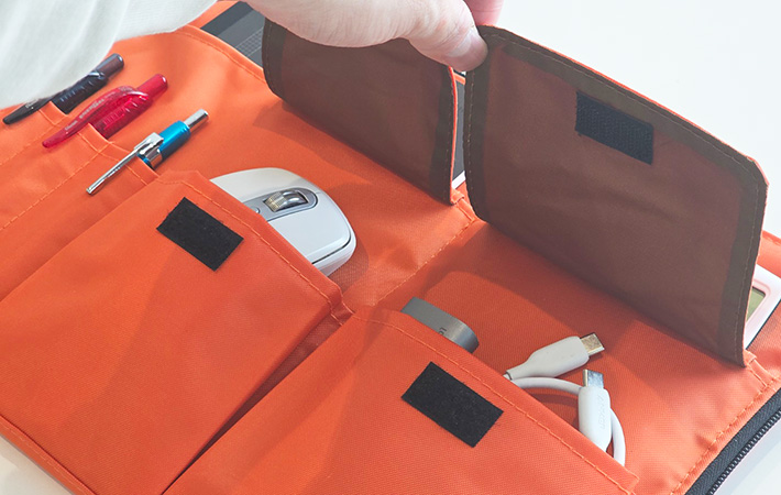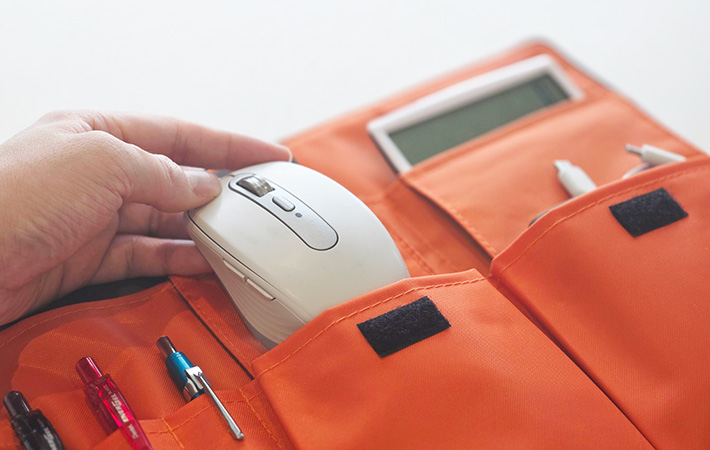 筆者はマウスのほか、充電ケーブルやUSBハブなどの小さなアイテムをまとめて入れていますが、かさばりがちなPC周辺機器も無理なく収まりました。